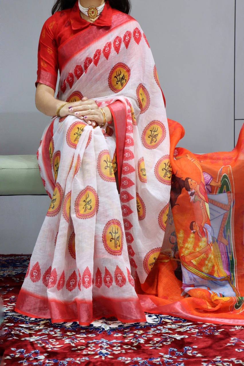 👜Devotional Linen Printed Saree With Printed Blouse 👜💯