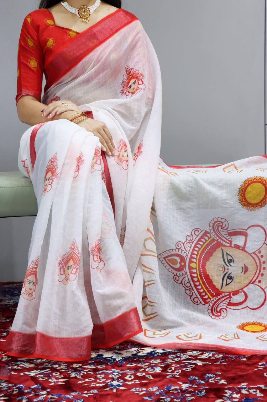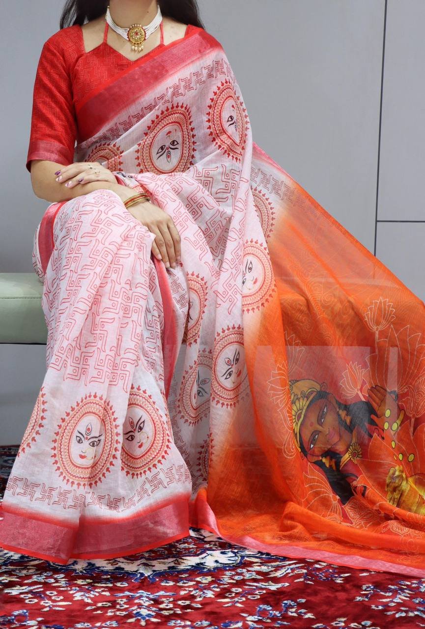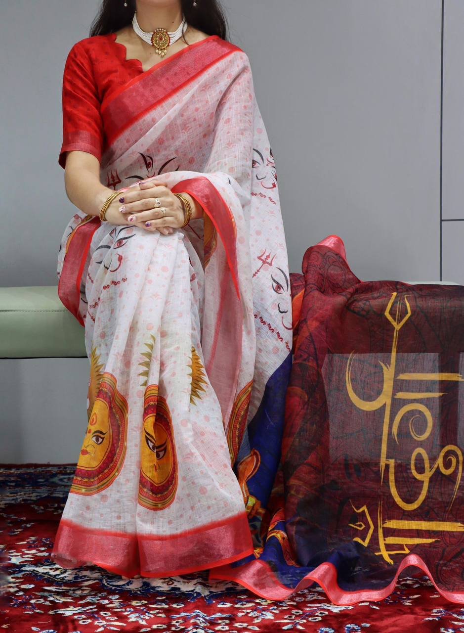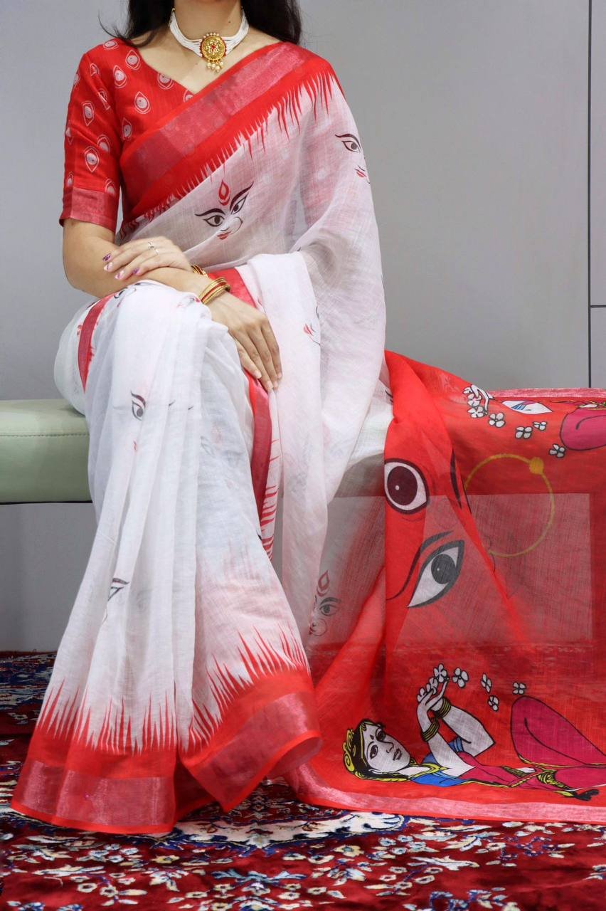 Linen is known to be a healing fabric, as the colors, motifs and the narration of magical forms create an aura that heals an individual physically and spiritually. Shop the Most Beautiful Durga Pooja Special Sarees.
