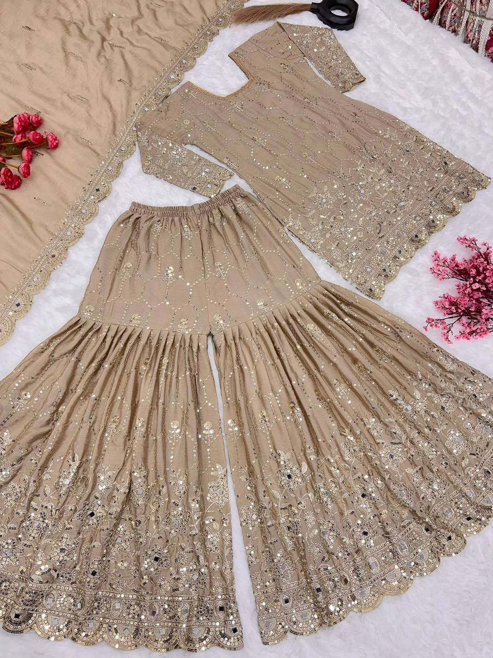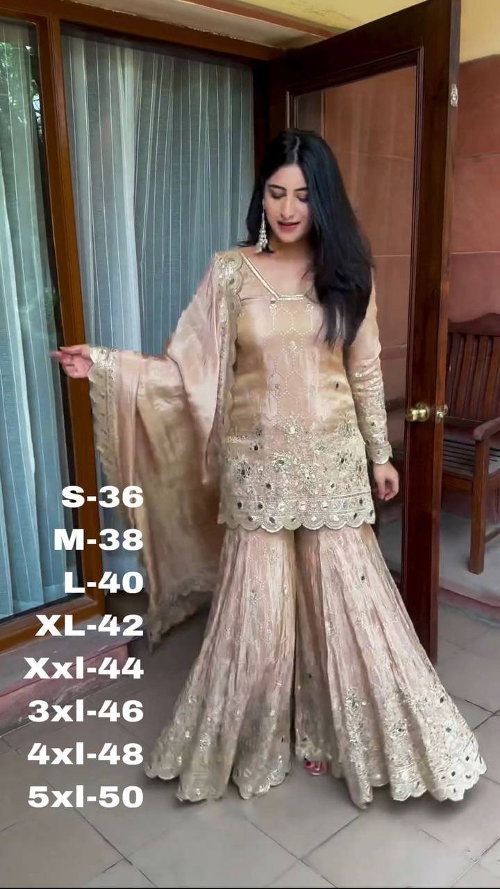 *Sharara Fabrics* :Pure Heavy Chinnon Silk With Embrodary Siquance Work With Real Mirror Hand Work