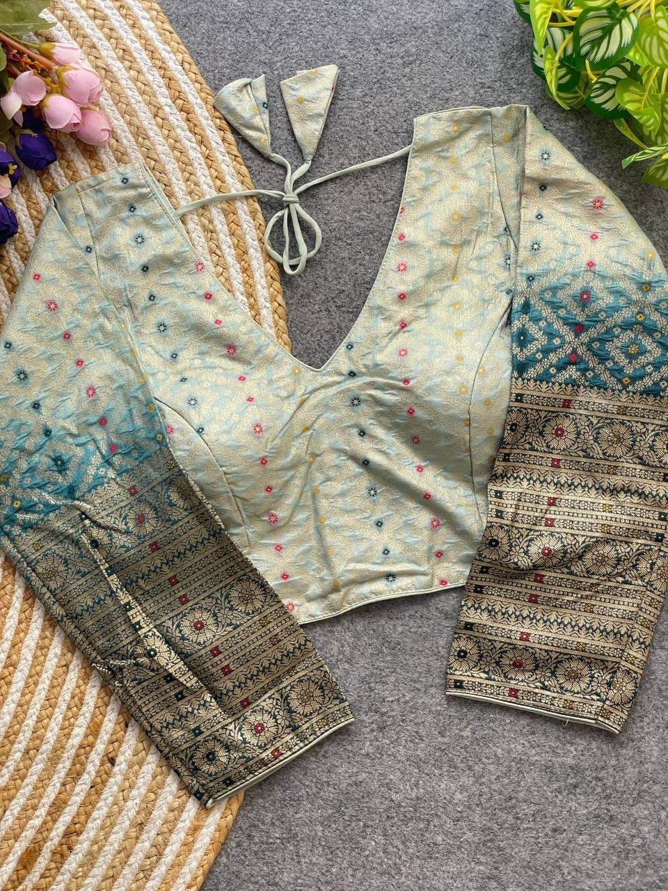 Blouse jari in two-toned and multi-butt print, V-shape neck in Sabyasachi pattern