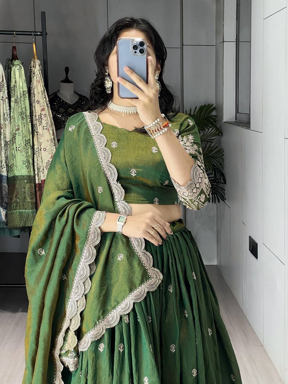 Classical Olive Green Embroidery Lehenga Fully Stitched with 3.5 mtrs Flair
