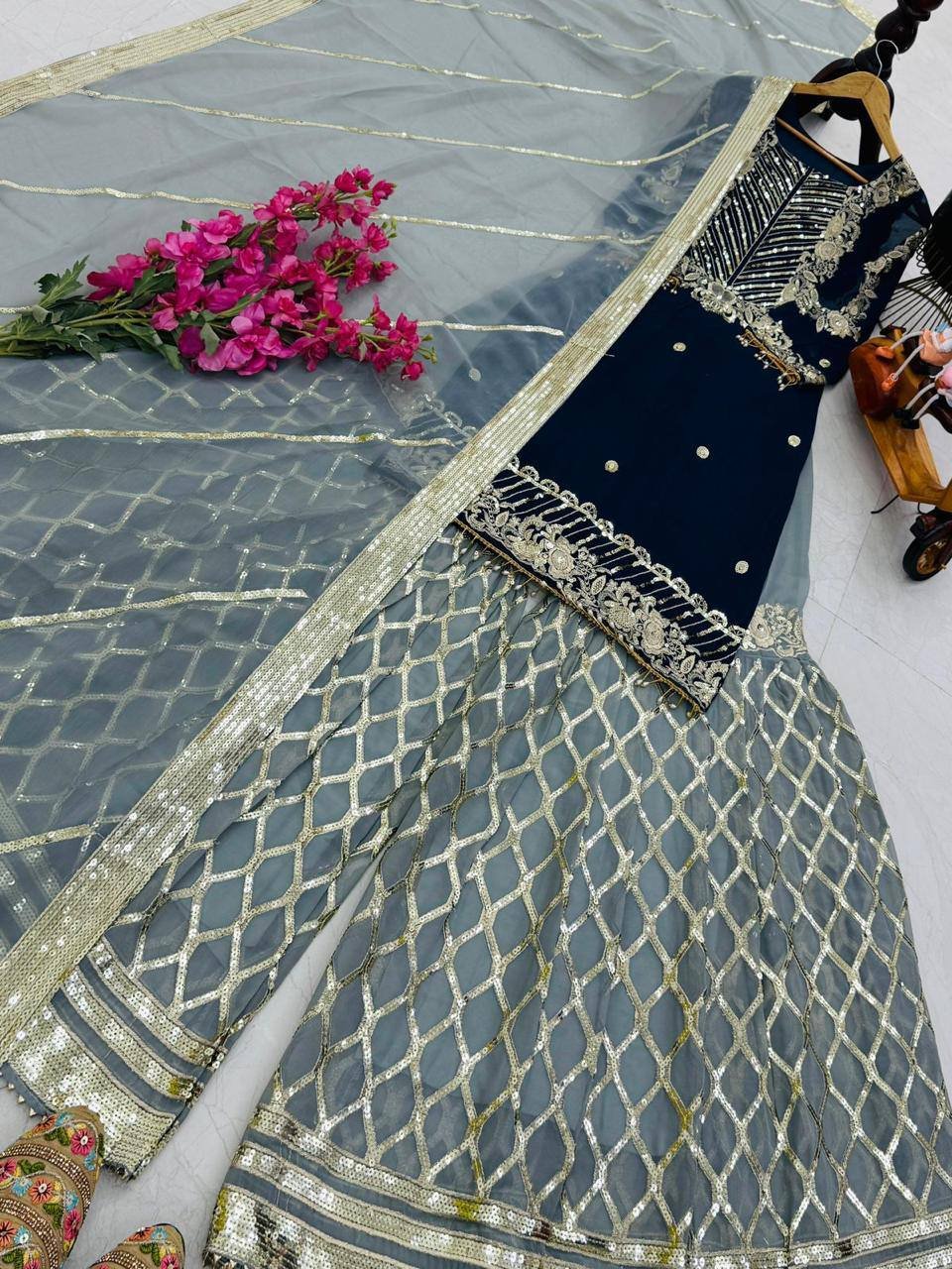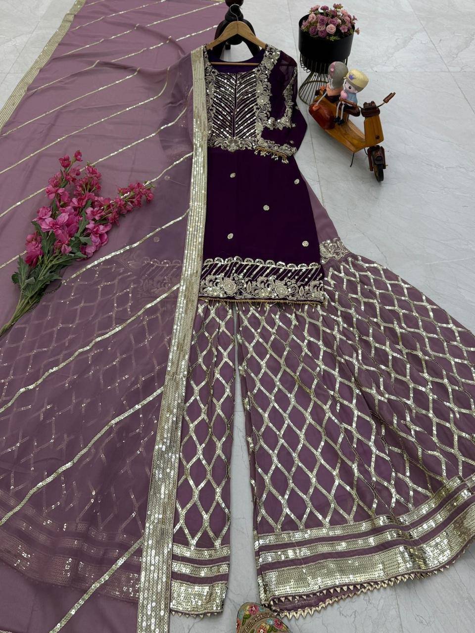 *Palazzo Febric :-* Fox Georgette Hevy Embroidery Siqunce Work