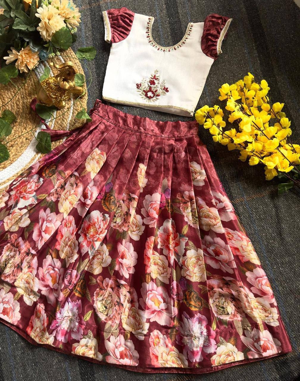 Elegant floral-printed lehenga and embroidered white choli set