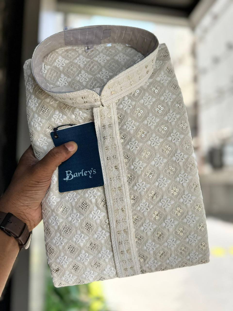 Exclusive Men’s kurta and Pajama Set in All White Chikankari Sequin Work (9 Designs)