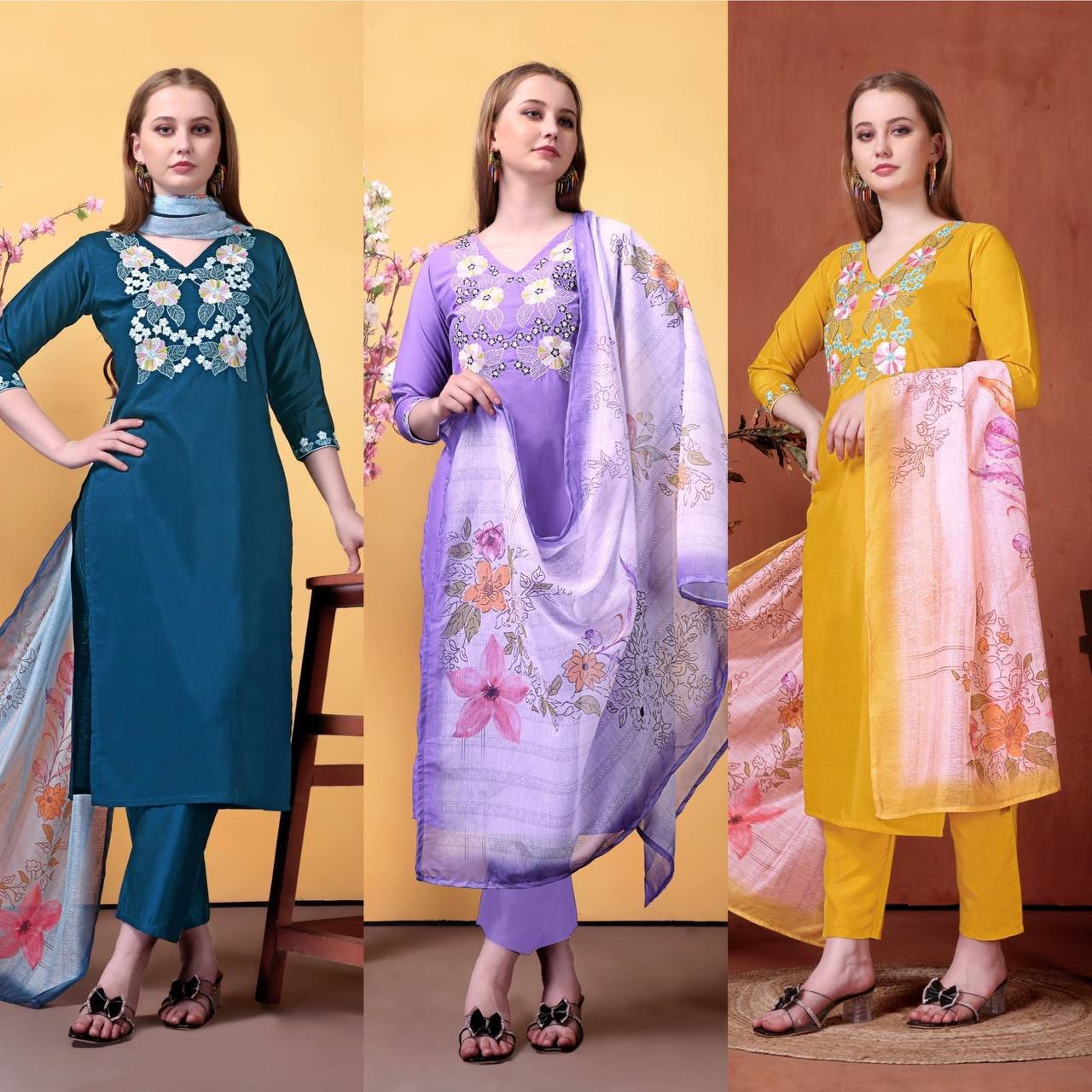HEAVY REYON SLUB WITH SEQUENCE EMBROIDERY WORK Suit Set (3 Colors)