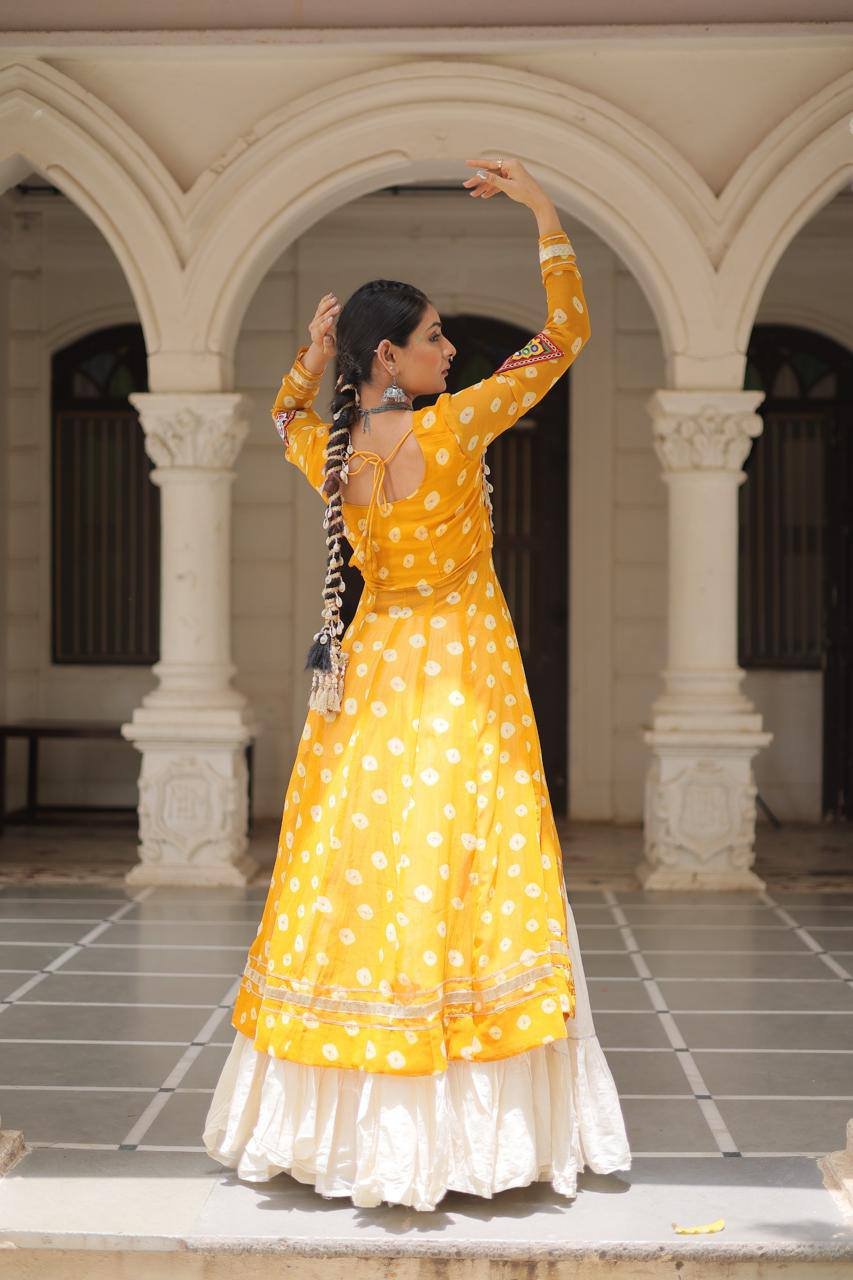 👉🏻 Fabrics & Work :- Bandhani Print work with kutchi patchework in Faux Georgette.