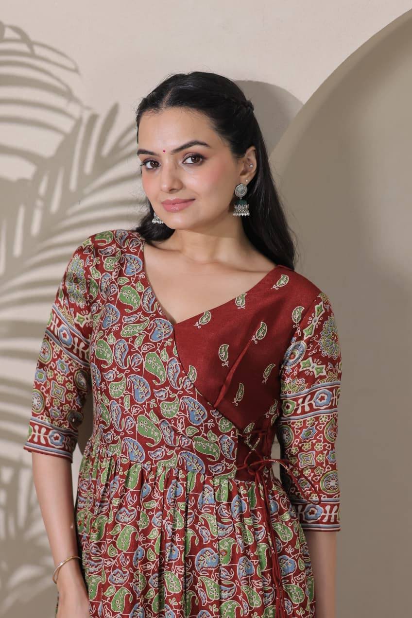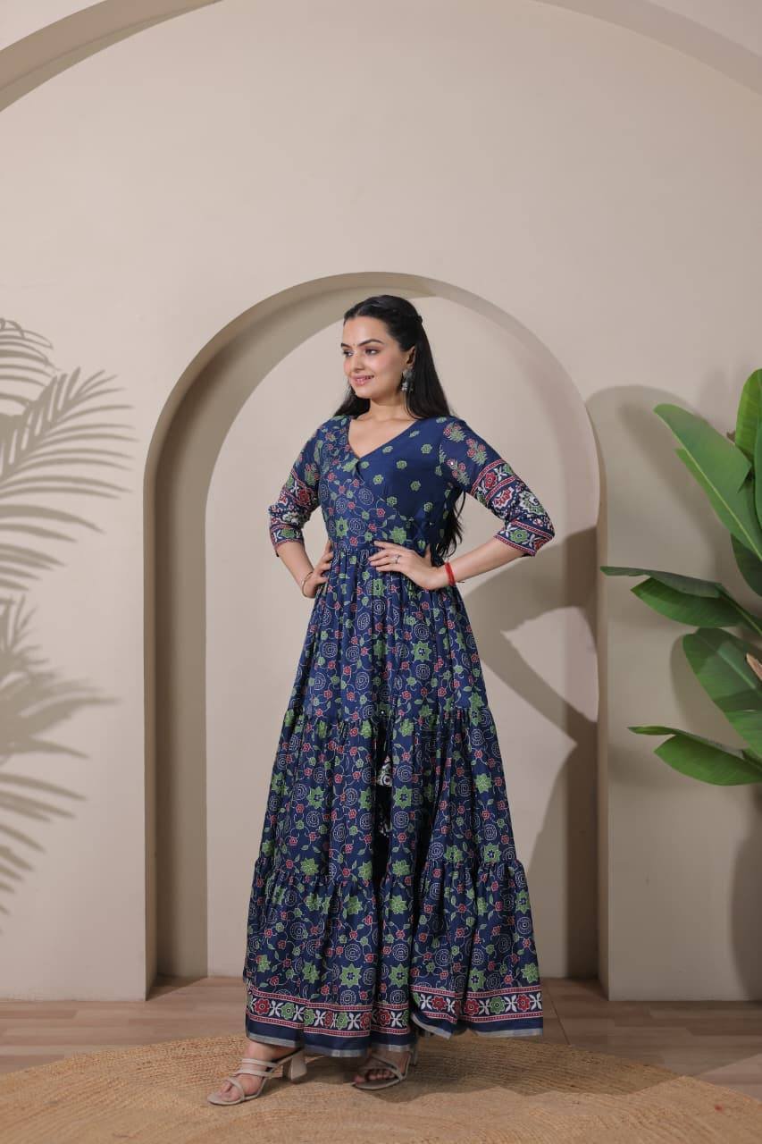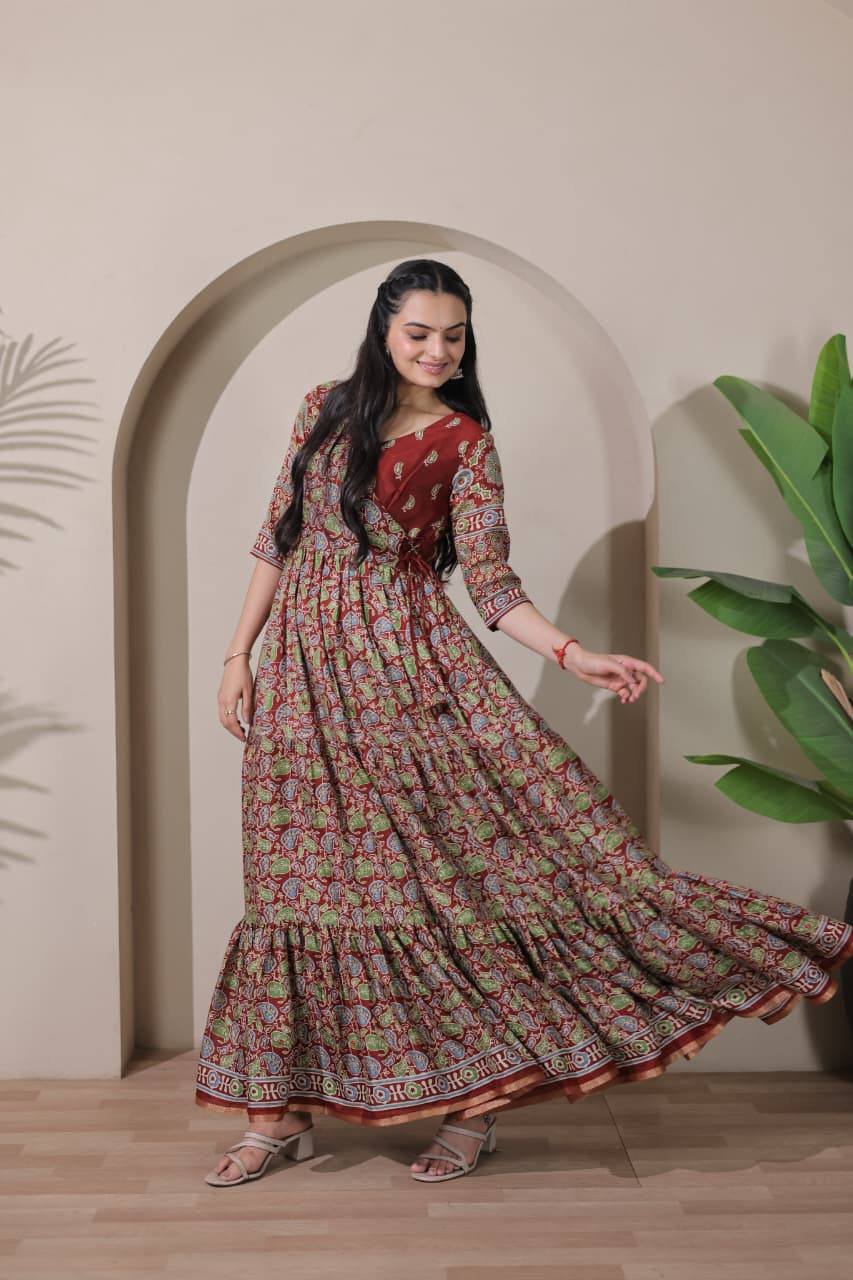 A beautifully crafted tiered Angarakha gown featuring a graceful flare and delicate embroidery highlights. Elegant, flowy, and perfect for any special occasion — a blend of tradition and modern charm.