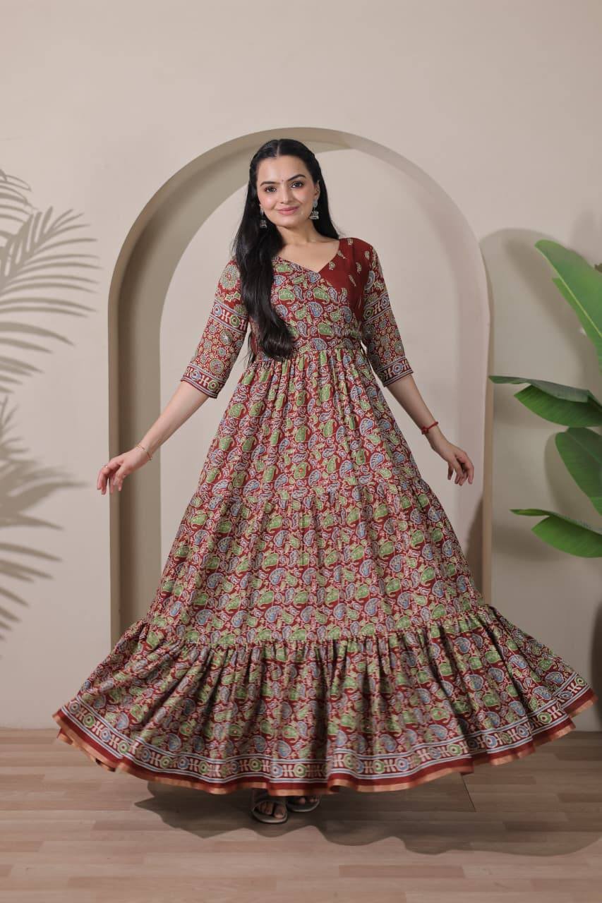 New catalog in beautifully crafted tiered Angarakha gown with 7 mtrs Flair (2 Colors)