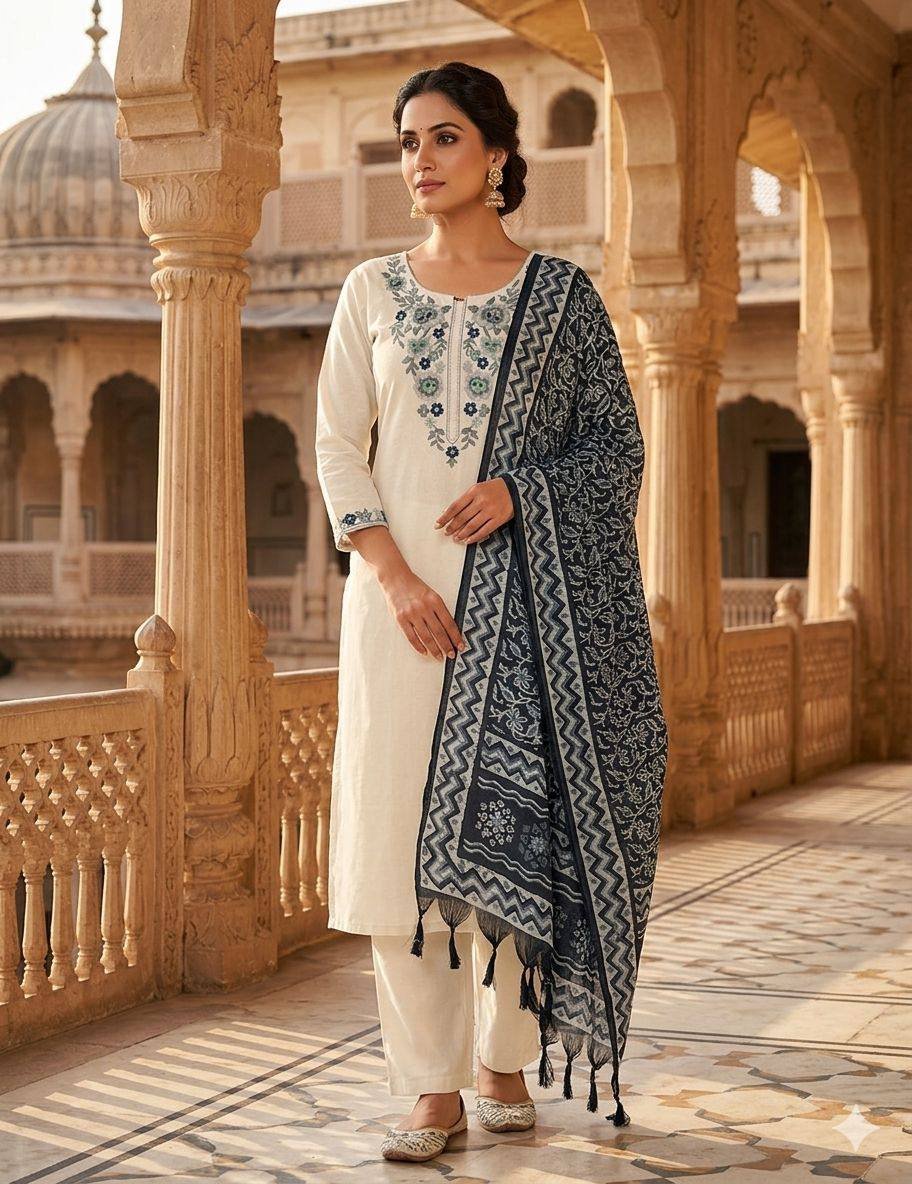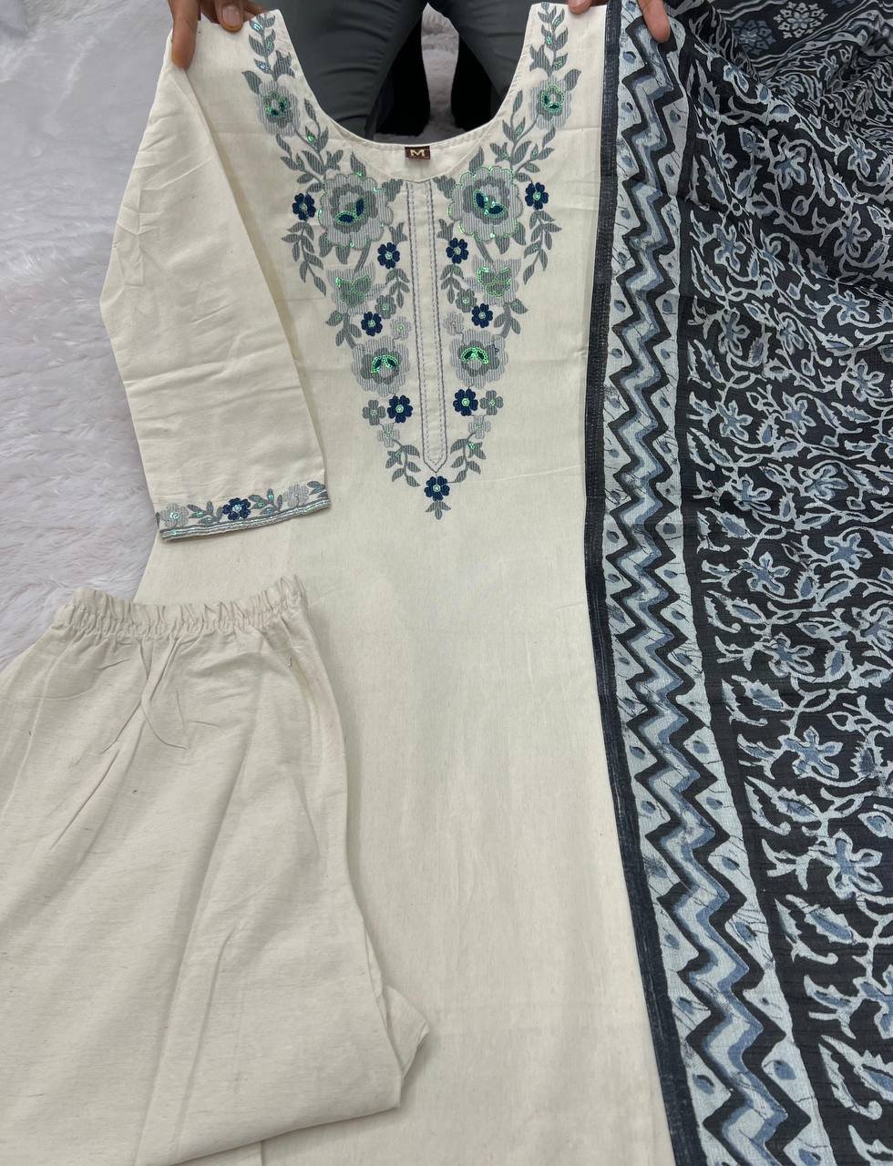 New Designer Khadi Cotton with Embroidery Suit Set