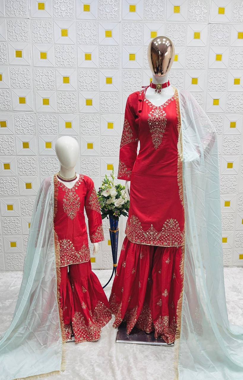 PREMIUM DESIGNER READYMADE TOP PLAZZO & DUPATTA Set – Mom-Daughter Combo