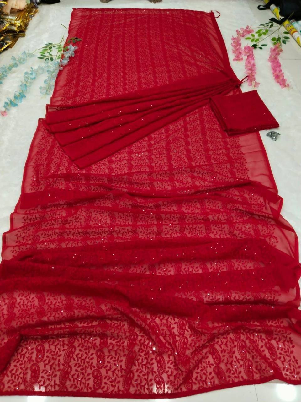 Saree : Premium Georgette Embellished With Beautiful chikankari Embroidery,Sequins Work All Over Saree( Ready To Wear Saree)