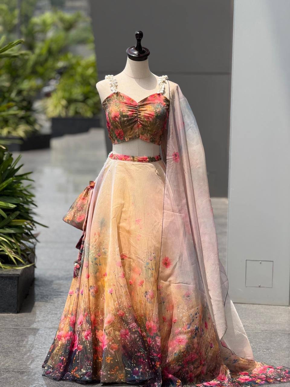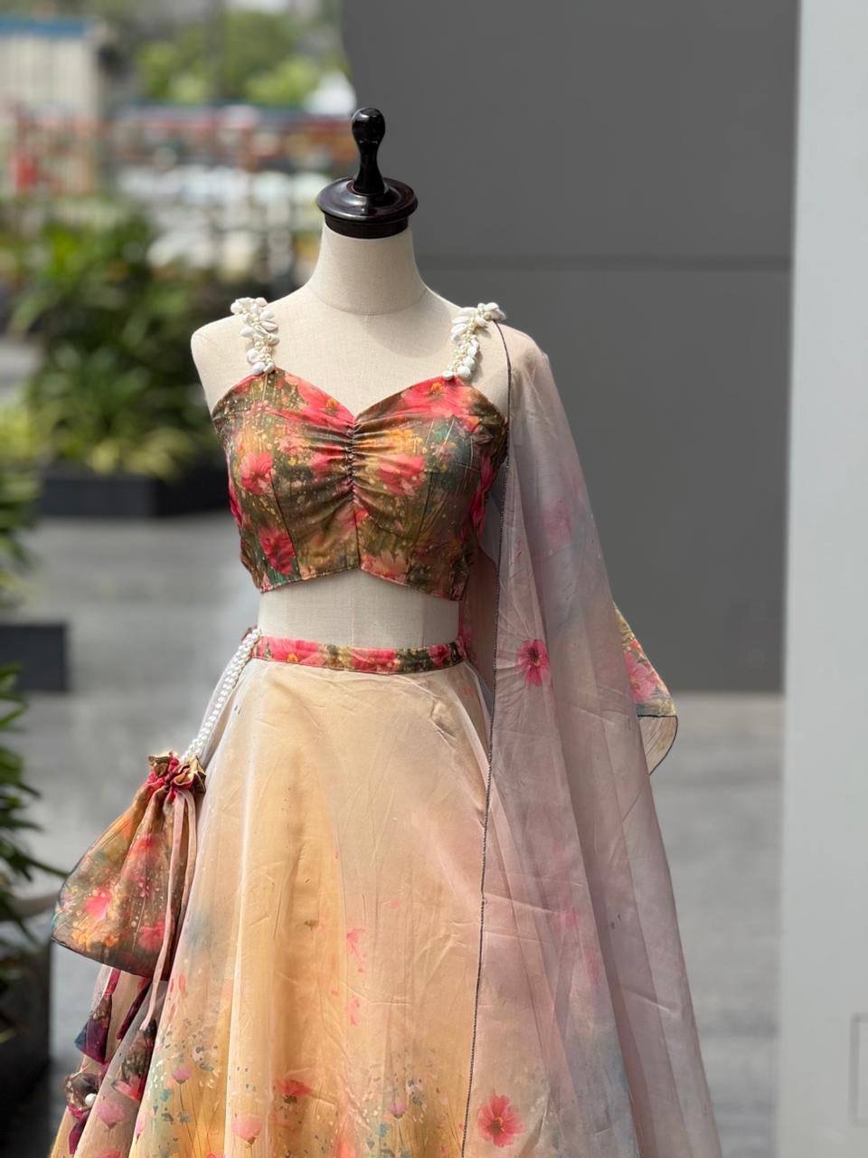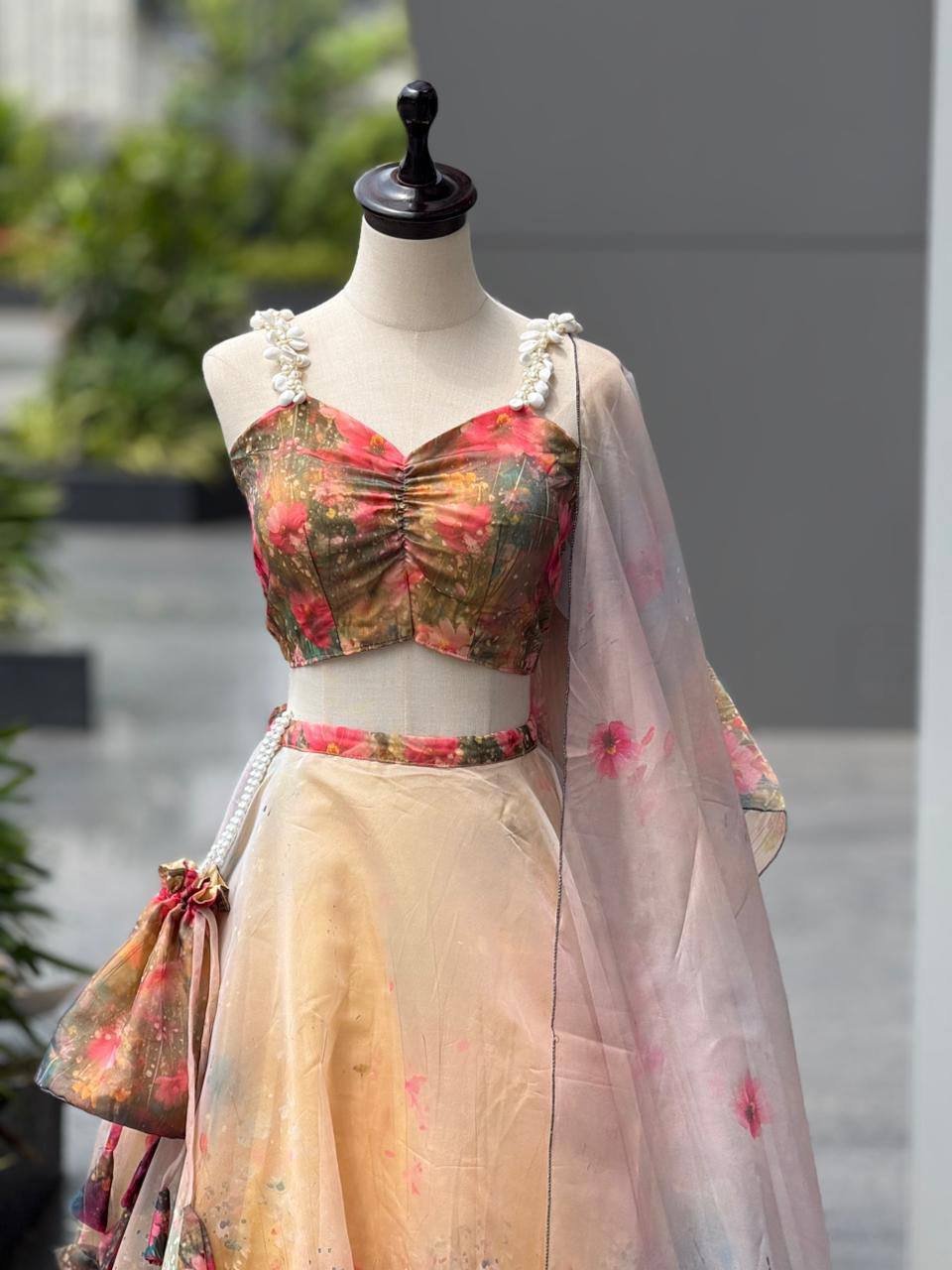 Pure Organza digital Print Fully Stitched Lehenga with pearl and kodi shoulder strip (With Purse)