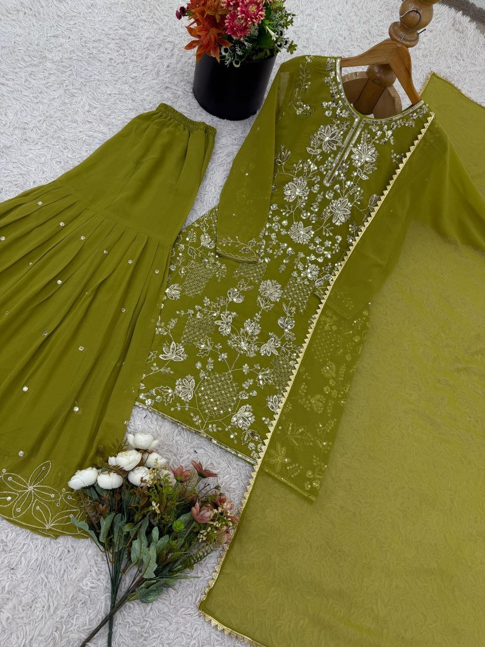 *Plazzo Fabrics* :Heavy Faux Georgette With Embroidery Sequence With Fully Flair