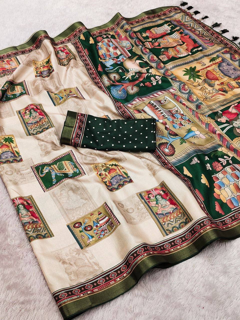 Rich Figure digitally printed Pallu. Paired with contrast polka dot printed Blouse.