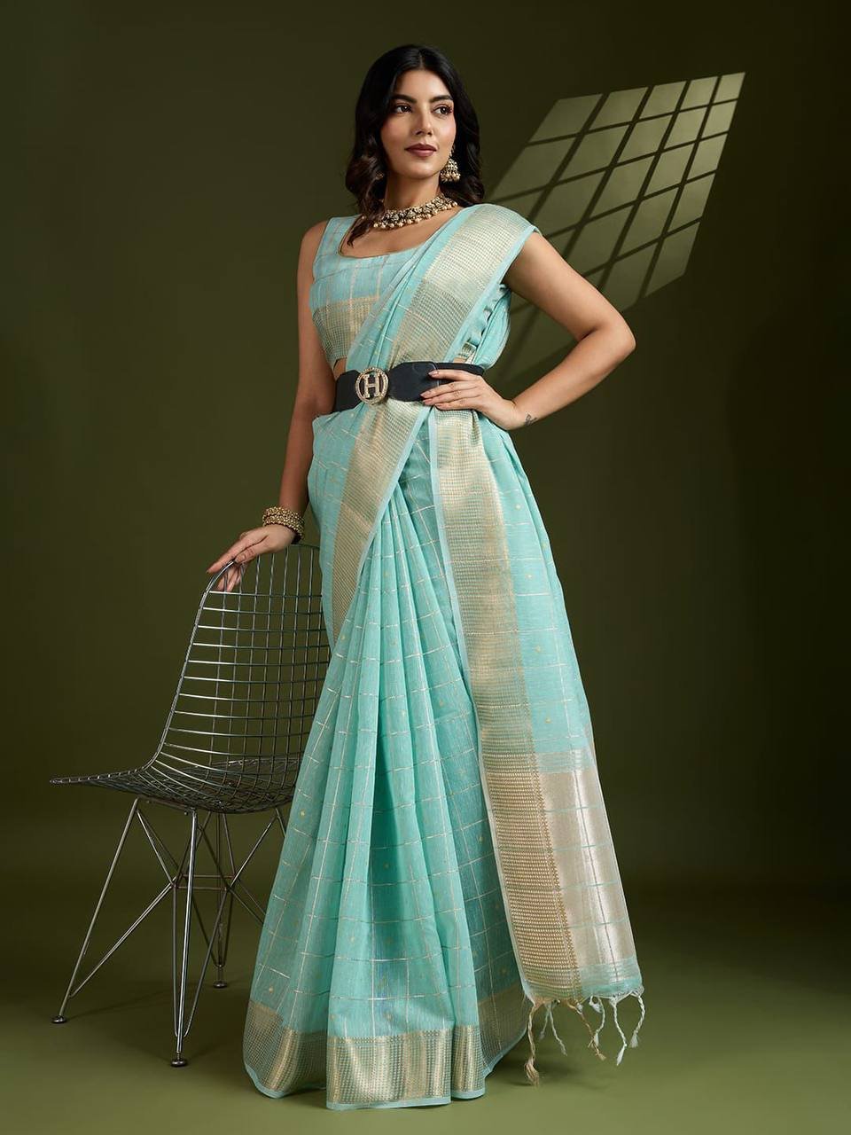 SOFT TISSUE LINEN SILK SAREE WITH ALL OVER GOTA-PATTI WEAVES CHECKS BODY AND TINY GOLD ZARI WEAVE BUTTIES WITH RICH ZARI WEAVE PALLU AND BORDER WITH RUNNING BLOUSE PIECE